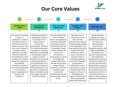 Mission StatementWe empower construction professionals and self-employed workers to take control of their finances, simplify compliance, and save thousands. By delivering tailored solutions, leveraging cutting-edge technology, and providing proactive guidance, we enable our clients to focus on building successful businesses while enjoying peace of mind over their finances.